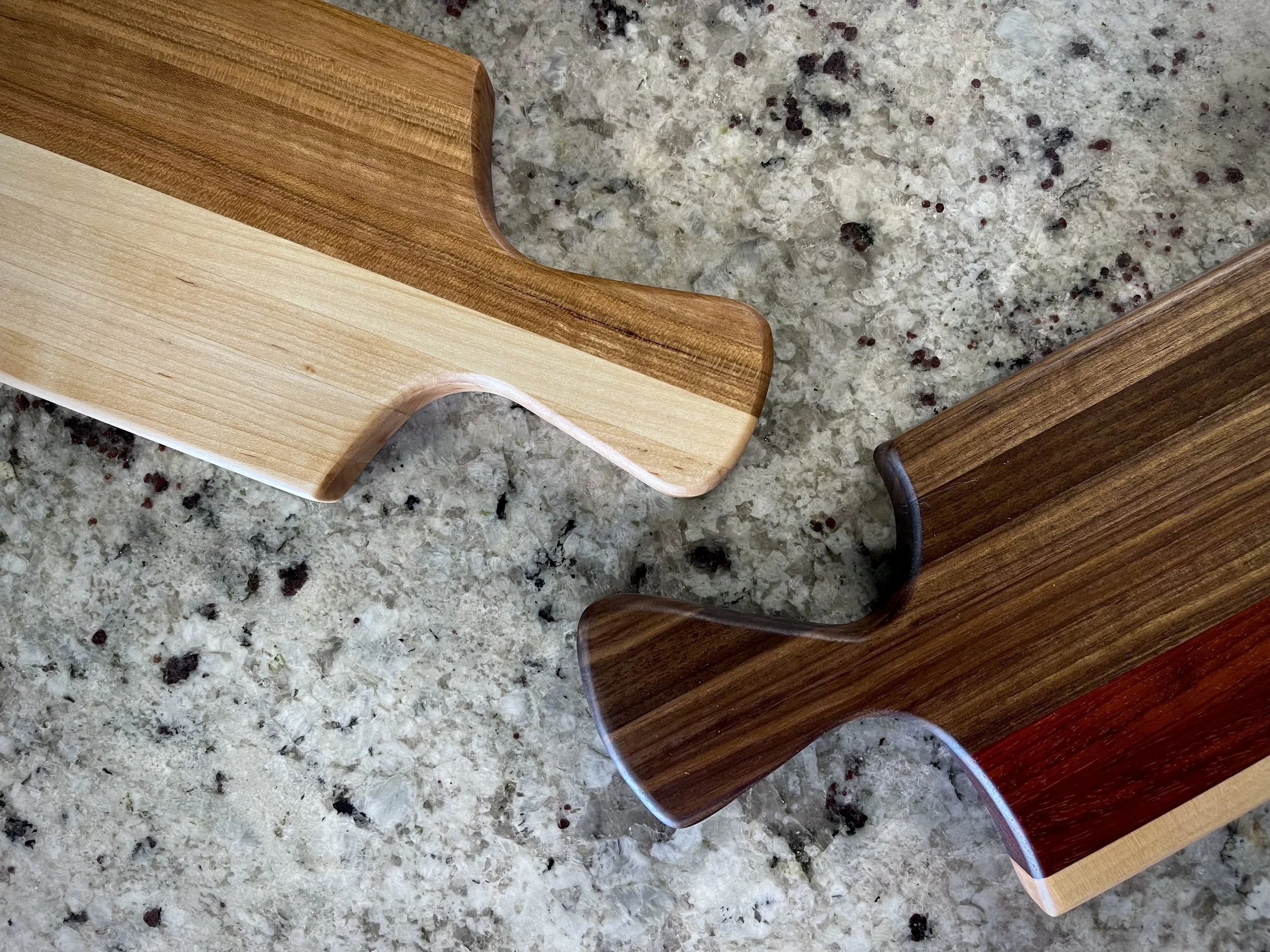 We offer 2 standard sizes of charcuterie boards—small and large. We make either size with full-width finger grooves or cutout handle. If you’re looking for a different size, handle type, or other custom options (see below), we’ll be glad to work with you to create a custom board to fit your needs.
